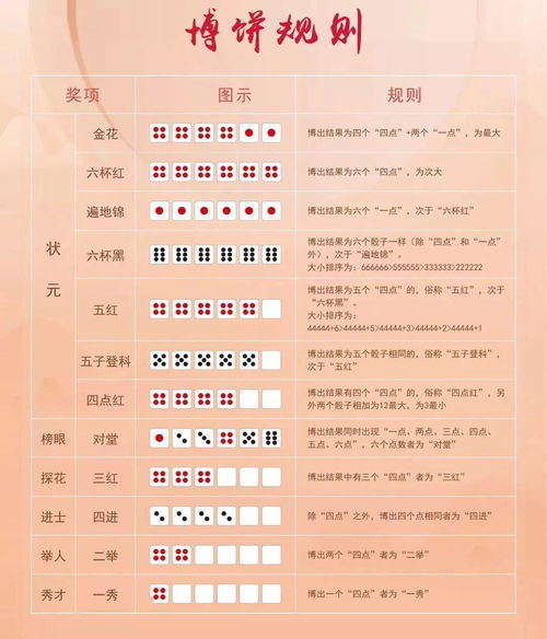 博饼游戏,简单又有趣。参与者需要投掷六个骰子,根据点数组合来获得不同的奖品。奖品等级从高到低分别为状元、对堂、三红、四进、二举和一秀。每个等级对应的奖品数量和具体规则如下: