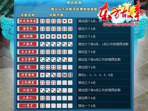 - 二举博:在这个玩法中,参与者需要两次抛掷骰子,并根据两次结果的组合来决定获得的奖励。例如,如果第一次抛掷的结果是全豹子,那么第二次的点数将会决定奖励的金额或种类。